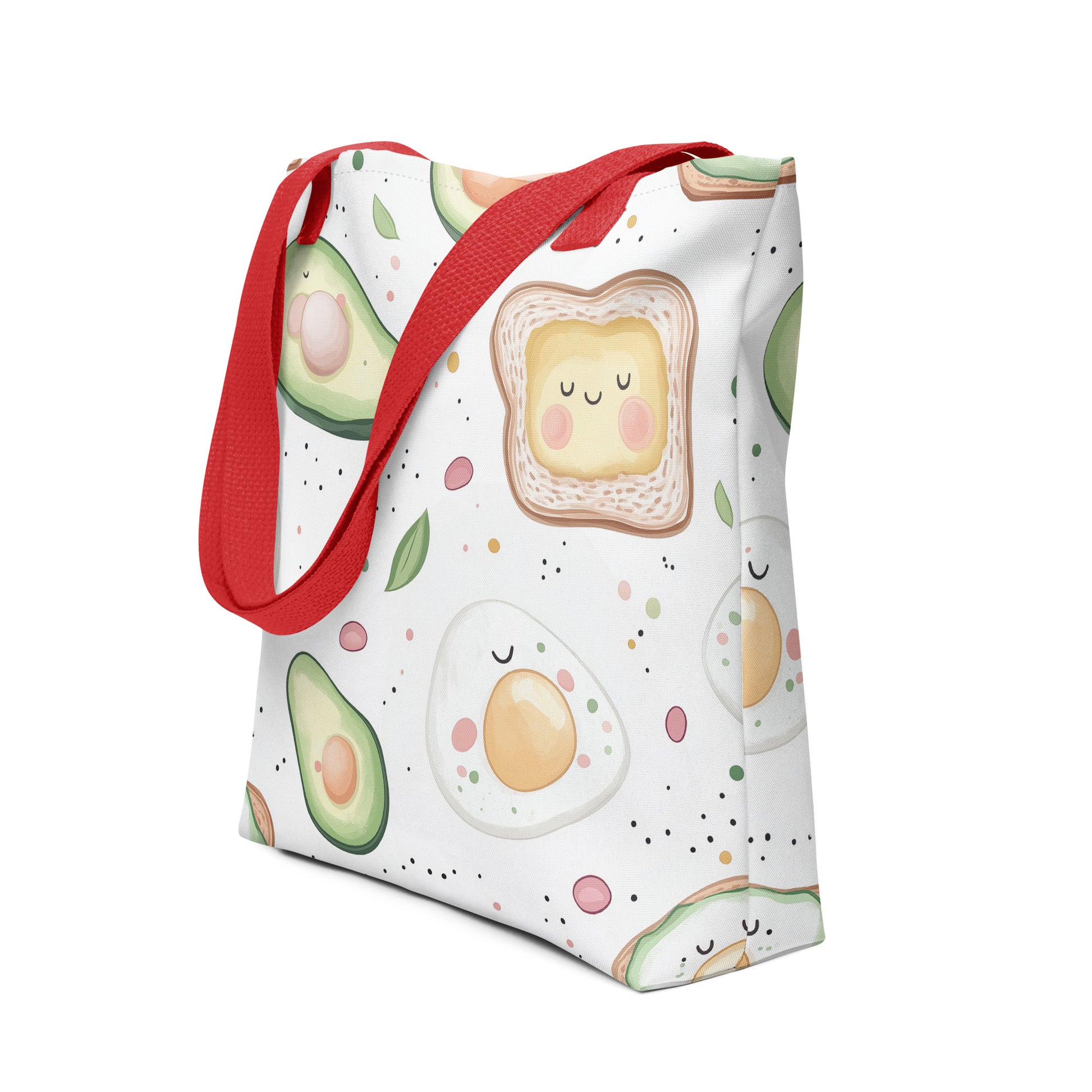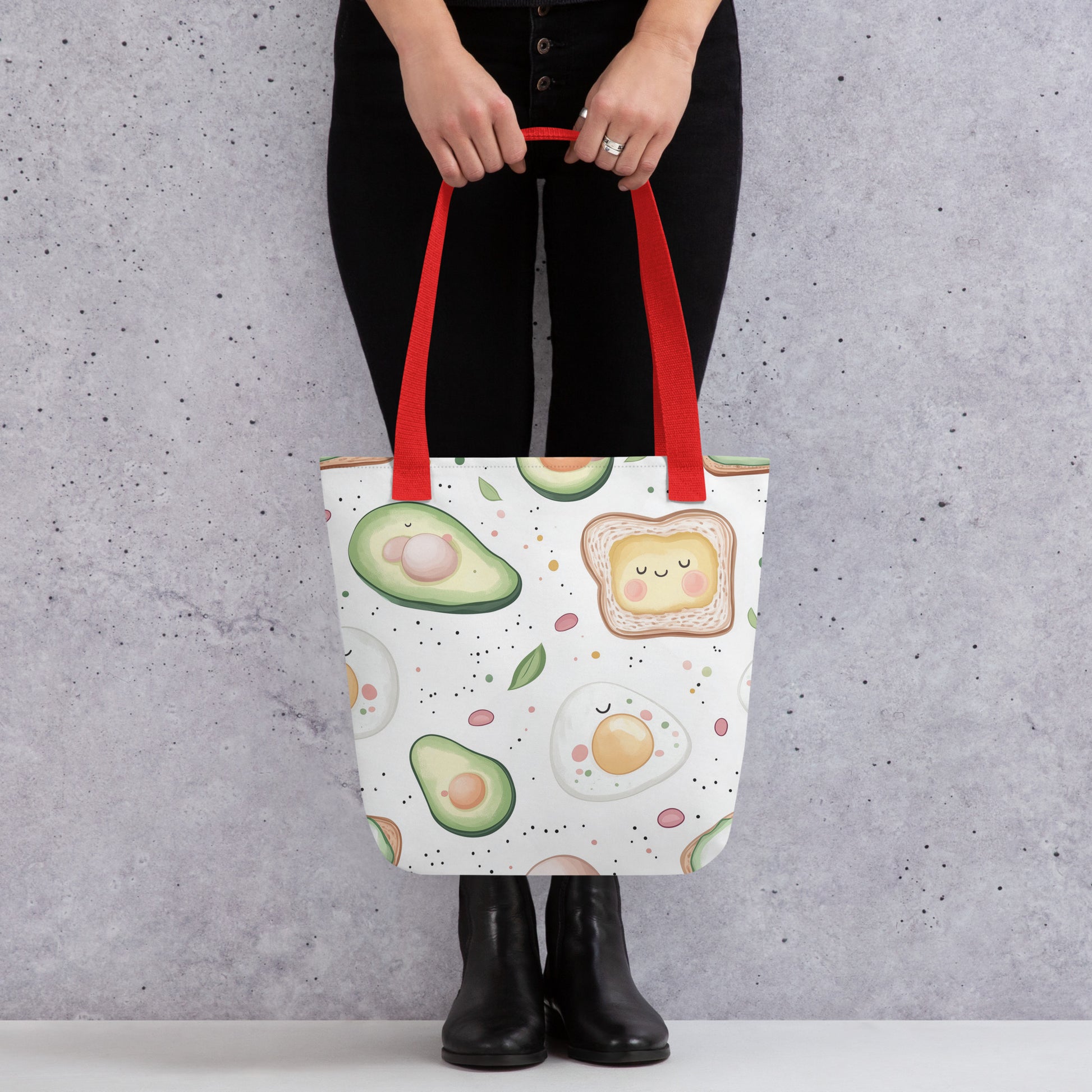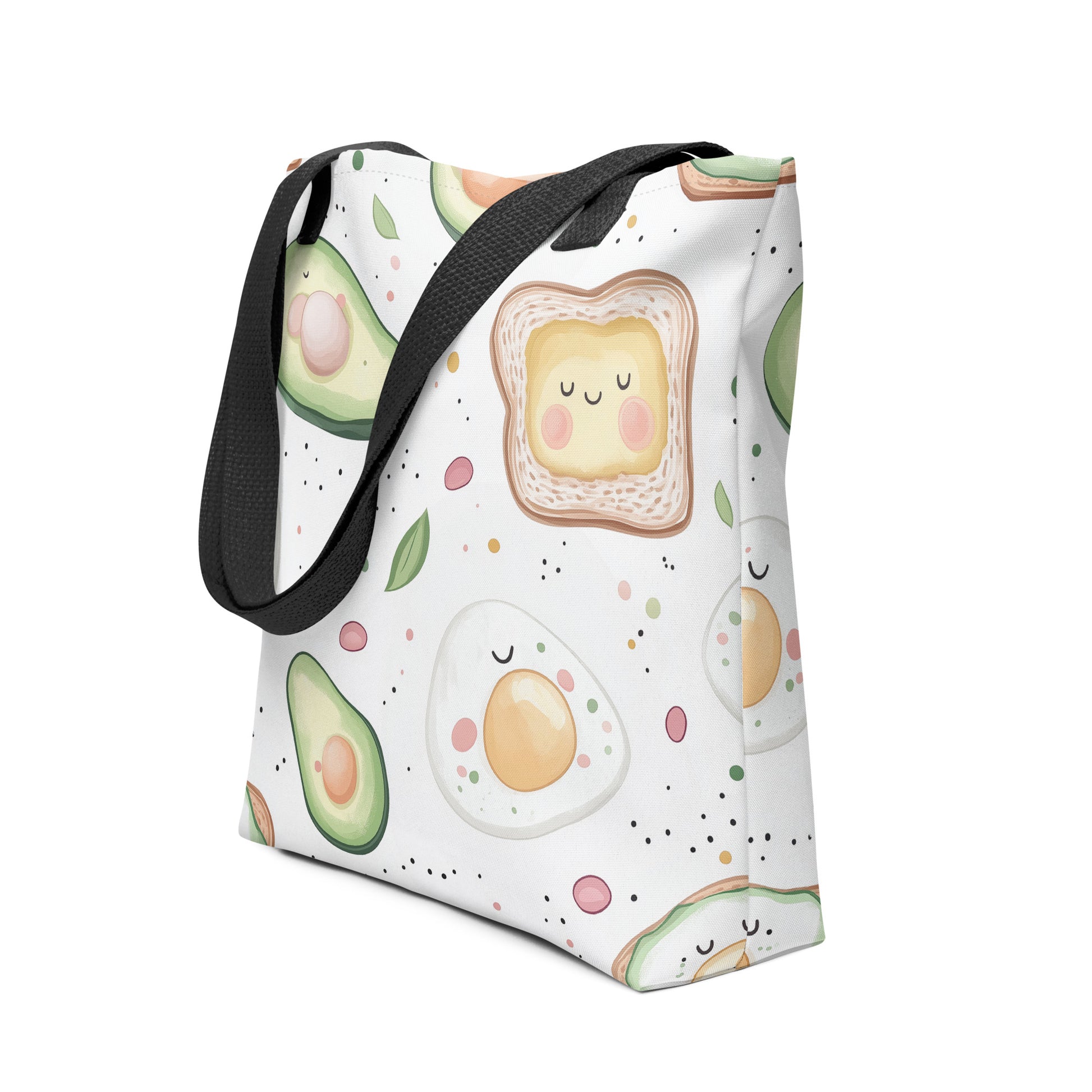 Bring a smile to your day with this delightful tote bag, showcasing a whimsical design of eggs, avocado, and toast. It's perfect for food lovers and anyone who enjoys quirky, playful styles.